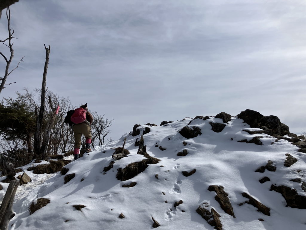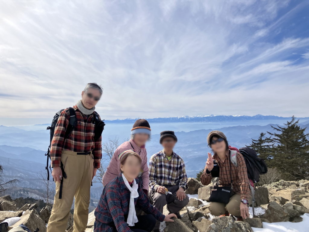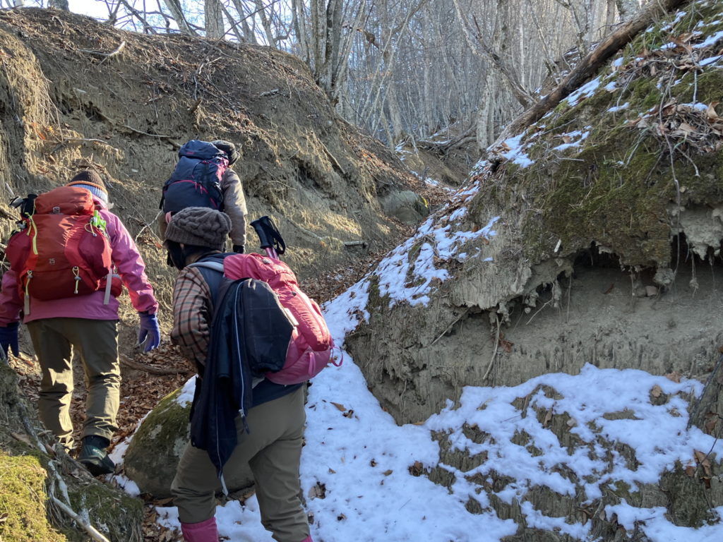 間も無く山道に入る。冬枯れの山は、寂しく物悲しい感じがするが、皆んなの元気で賑やかな声で明るい山に変わる感じがする。最初の峠、旧正丸峠に到着。ここから先の、虚空蔵峠迄は、サッキョ峠、七曲峠を経ての長いアップダウンの繰り返しが続く。谷の両側からの冷たい風に、終始悩まされる。急な下りが待っていたが、何本ものロープに助けられ、全員無事着地。間も無く、目指す、虚空蔵峠に到着。待ちかねた、昼食タイム。和気藹々と楽しい昼食も終え、12時にカバ岳を目指す。途中、チョット緊張を強いる大きな石を超え、カバ岳に到着。岳、と言っても尾根の平らな通過点。カバ岳に因んだジョークも交え暫しの撮影タイム。