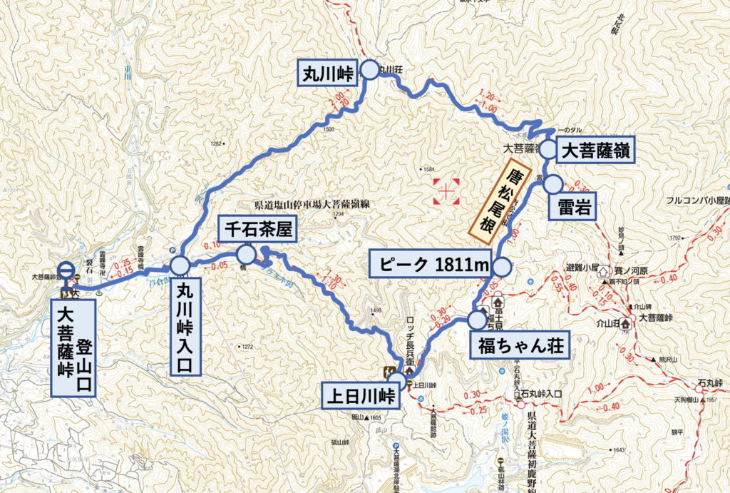 正丸駅歩き出し8:35―旧正丸峠10:05―サッキヨ峠10:50―虚空蔵峠11:25―牛立久保12:35―カバ岳13:30―大野峠13:55―大野峠登山口15:15―芦ヶ久保駅15:50
