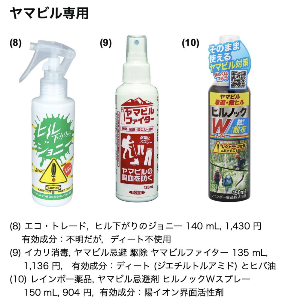 (4) ヒル専用:ヒルノック,ヤマビルファイター,ヒル下がりのジョニー,タイガーバーム (塗り薬),など。ヤマビルファイターの成分はディートですが,その他の忌避剤の成分は不明。残留臭についての情報は集めていません。