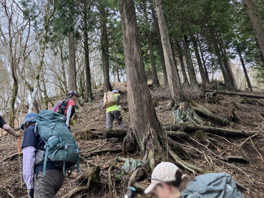 満開のミツマタが斜面一面に広がるミツバ岳山頂を経て、権現山へ。右手に広葉樹、左手に杉林が続く稜線からは、丹沢湖越しに蛭ヶ岳や大山が望めました。権現山で昼食休憩後、屏風岩山へ。崩落しかけた崖道や木の根をよじ登る箇所など、バリルートらしいワイルド感が増していきます。