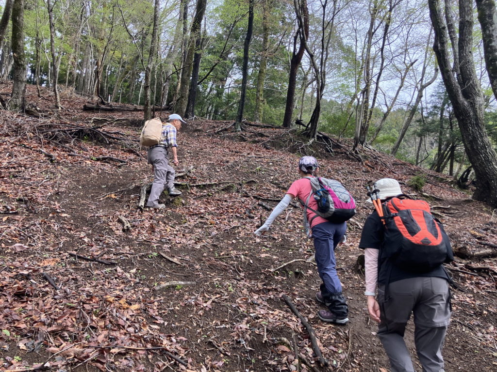 新松田駅8時発、タクシー2台で丹沢湖畔「滝壺橋」へ。登山口からミツバ岳へ向かいます。本日のお楽しみは後半の道なき下山ルートのため、体力を温存しつつ急登を進みました。20度超えの陽気で、今シーズン初のヒルにも遭遇しました。