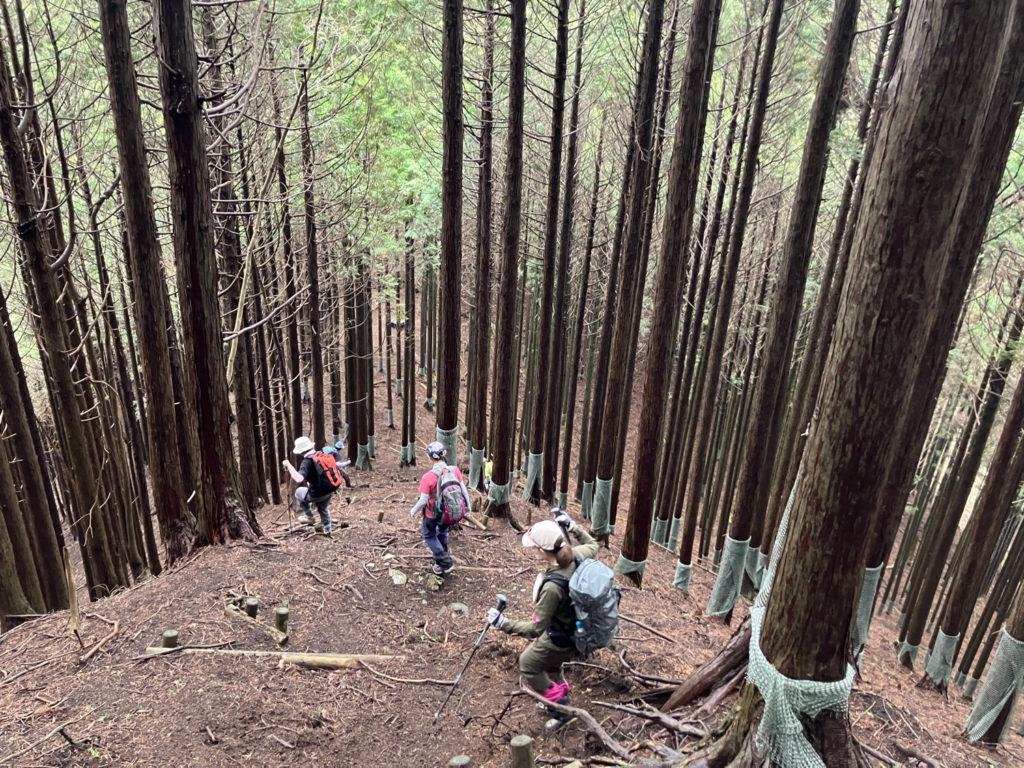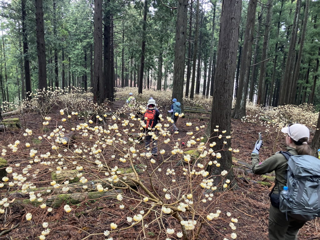 満開のミツマタが斜面一面に広がるミツバ岳山頂を経て、権現山へ。右手に広葉樹、左手に杉林が続く稜線からは、丹沢湖越しに蛭ヶ岳や大山が望めました。権現山で昼食休憩後、屏風岩山へ。崩落しかけた崖道や木の根をよじ登る箇所など、バリルートらしいワイルド感が増していきます。