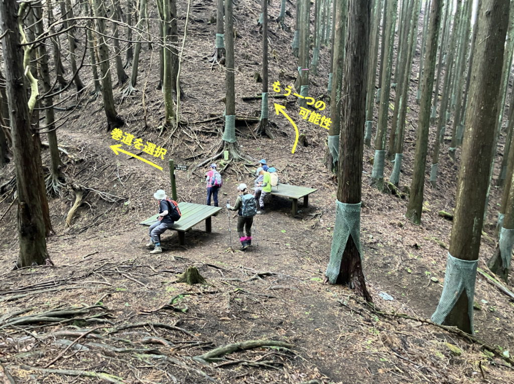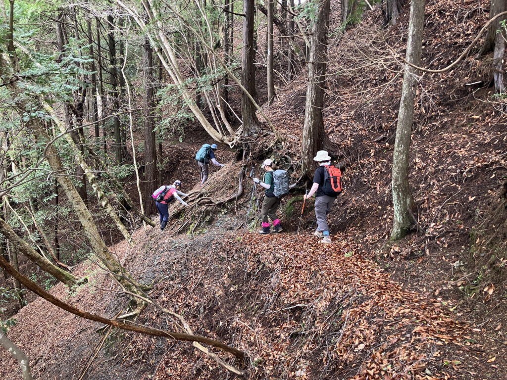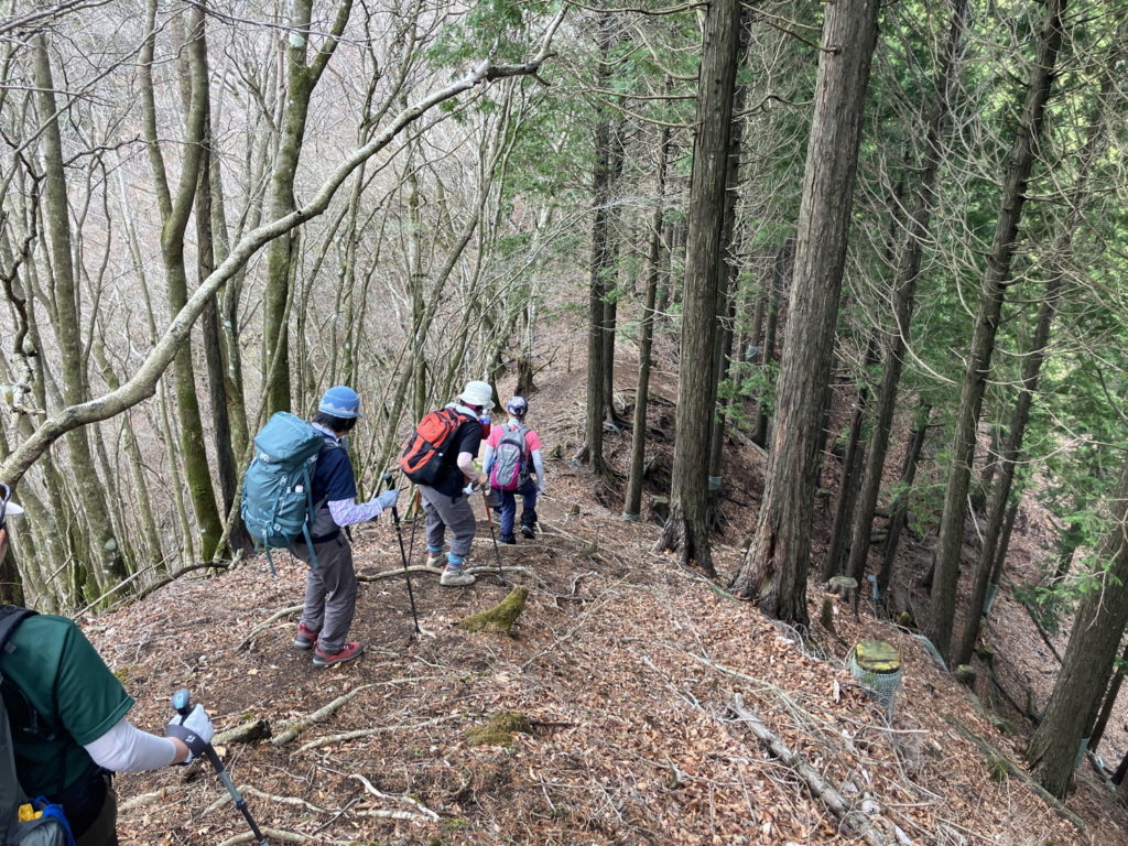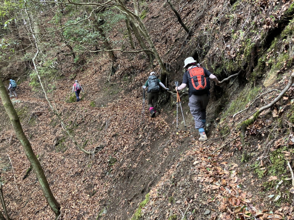 二本杉峠から屏風岩山へ向かう途中にある下りの急斜面は柔らかい土のため滑りやすい。補助ロープを薦める。