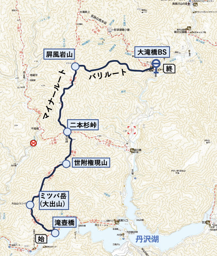 滝壺橋歩き出し8:45ーミツバ岳10:00ー権現山(世附権現山)11:15~45(ランチ)ー茅ノ丸(849m) 12:20ー二本杉峠12:30ー屛風岩山14:10ー大滝橋バス停16:10