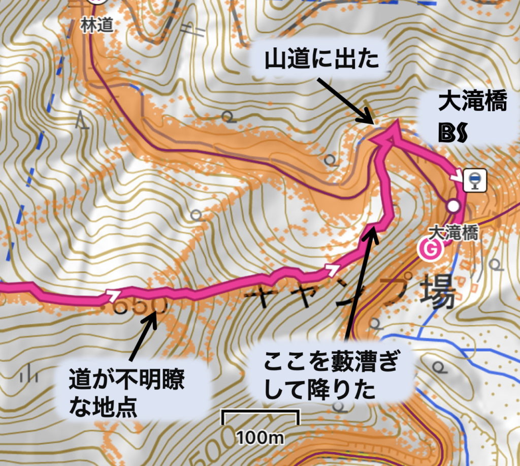 屏風岩山からの下り急斜面を過ぎたところにミツマタの群生地がある。そこを抜けた後、山道は不明瞭だ。鹿柵に沿って前進したが、背丈の薮の通過を強いられた。650m 地点で左に曲がる別ルートも選択肢の一つ。(ヤマケイオンライン地図にルートをマージ)
